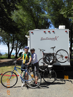 We decided to spend a few days in Baker City, Oregon, a delightful town on the edge of the Blue Mountains.  The area is rich with history related to the Oregon Trail and more than 100 homes and buildings on the National Historic Register.  Bob finally had a chance to bicycle today and we biked up to the National Historic Oregon Trail Interpretive Center.  He did alright for someone who hasn’t bicycled in several months.  My biggest advantage is that I am much more comfortable coming down the steep hills than he is, but he was right there with me climbing them.  The Interpretive Center is a beautifully appointed facility that gives a very realistic view of the hardships of going across the country in a covered wagon.  I must say that some of the same observations can be made about traveling across country in a travel trailer, particularly related to constant upkeep of your home on wheels for six long months.  I was delighted to see that the center had a penny press and even more so when the staff told me that it was only installed on Tuesday!  It’s been great fun to add to my collection as I bicycle across the country.